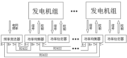 系統(tǒng)通訊連接示意如圖1所示:參加均衡的頻率變送器和多臺(tái)功率均衡器之間以RS422通訊方式兩兩相連,發(fā)送的T+與接收的R+相連,發(fā)送的T-與接收的R-相連,也可以不按照示意圖的次序連接,但必須保證形成通訊環(huán)路,首尾相連,并且任意一臺(tái)儀表的發(fā)送T+ 、T-端子只和相連的一臺(tái)儀表的接收R+、R-端子相連。RS422通訊連線使用屏蔽雙絞線,最長通訊距離為1220米,在通訊距離超過300米需要在兩端加阻抗匹配電阻(一般雙絞線為120歐)。