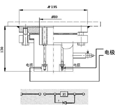 1、電極裝置安裝于油箱底部,開口尺寸φ80,信號裝置安裝在便于觀察使用地方,二者間宜用屏蔽電纜連接并在一點(diǎn)接地。裝于油箱底板的電極裝置有4個(gè)電極,可分別并聯(lián)使用其中兩個(gè)。
