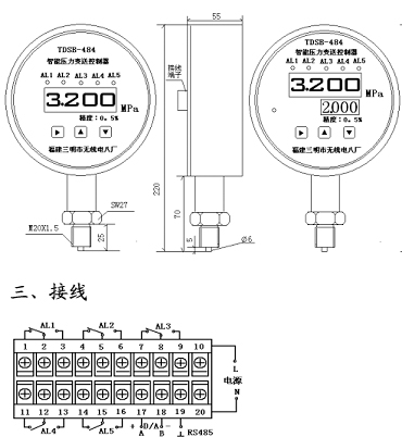 TDSB-484ZL系列壓阻式智能數(shù)顯壓力變送器、控制器是集壓力測量、顯示、控制于一體的多功能產(chǎn)品。該產(chǎn)品為全電子數(shù)字技術(shù)。結(jié)構(gòu),前端采用帶隔離膜充油芯體的壓阻式壓力傳感器,輸出信號由高精度、低溫漂和高可靠性的放大電路轉(zhuǎn)換為標準信號。它使用方便,參數(shù)在儀表盤面設(shè)定,廣泛應(yīng)用于電力、自來水、水處理、石油、化工、冶金等行業(yè),對流體介質(zhì)的壓力進行監(jiān)控,是指針電接點壓力表的理想替代產(chǎn)品。